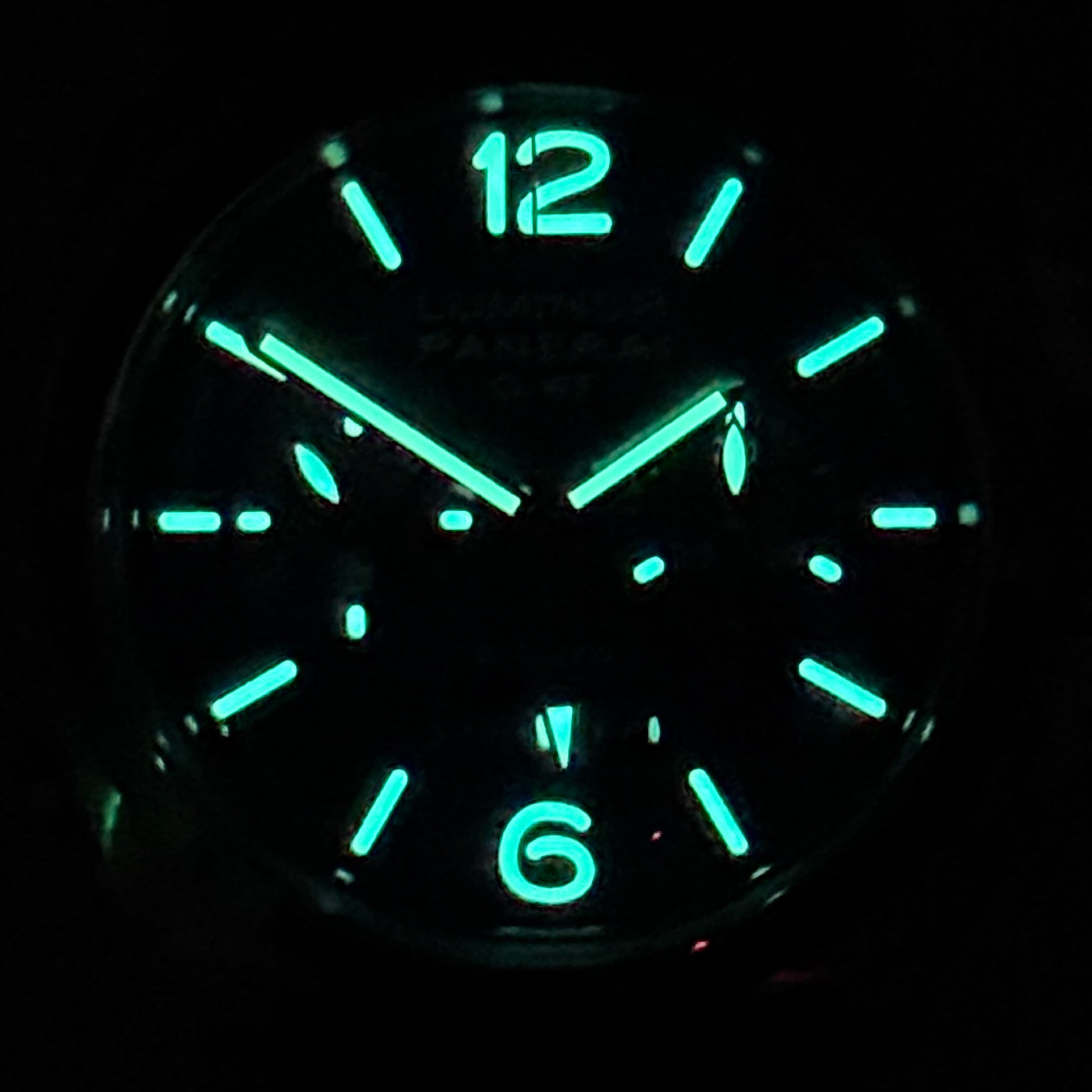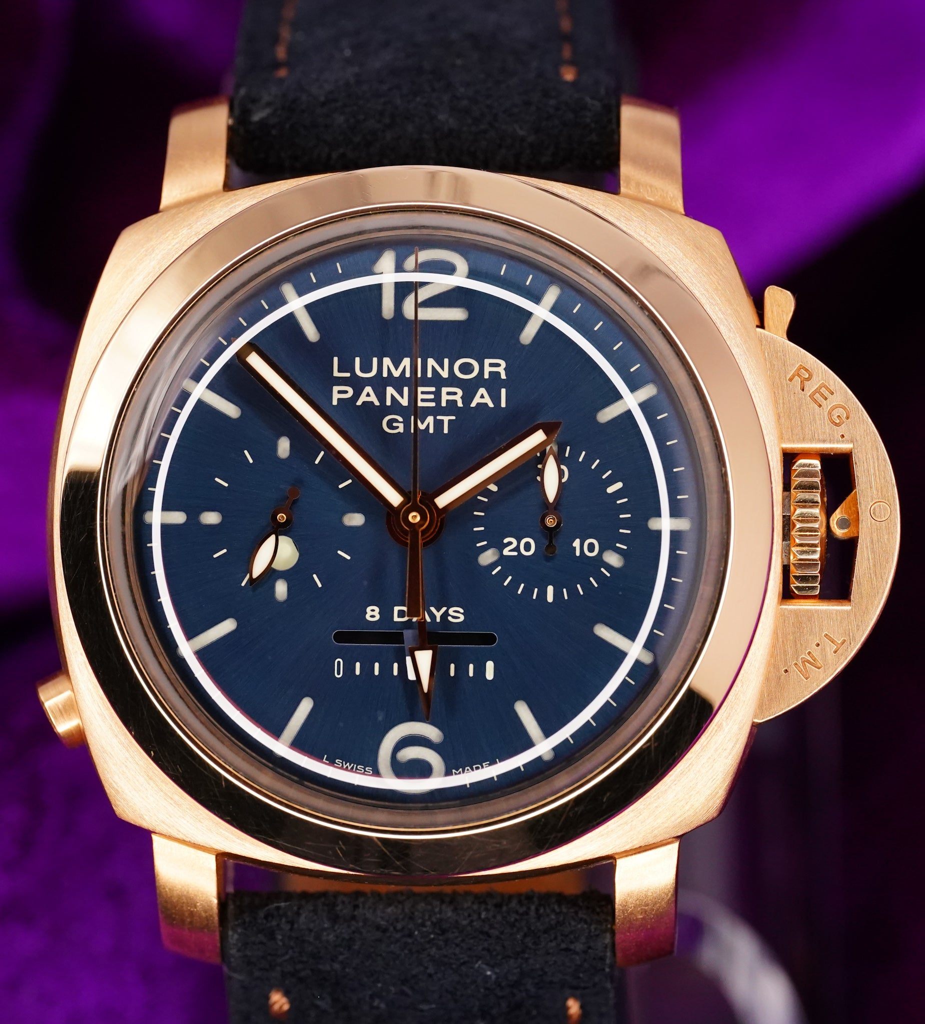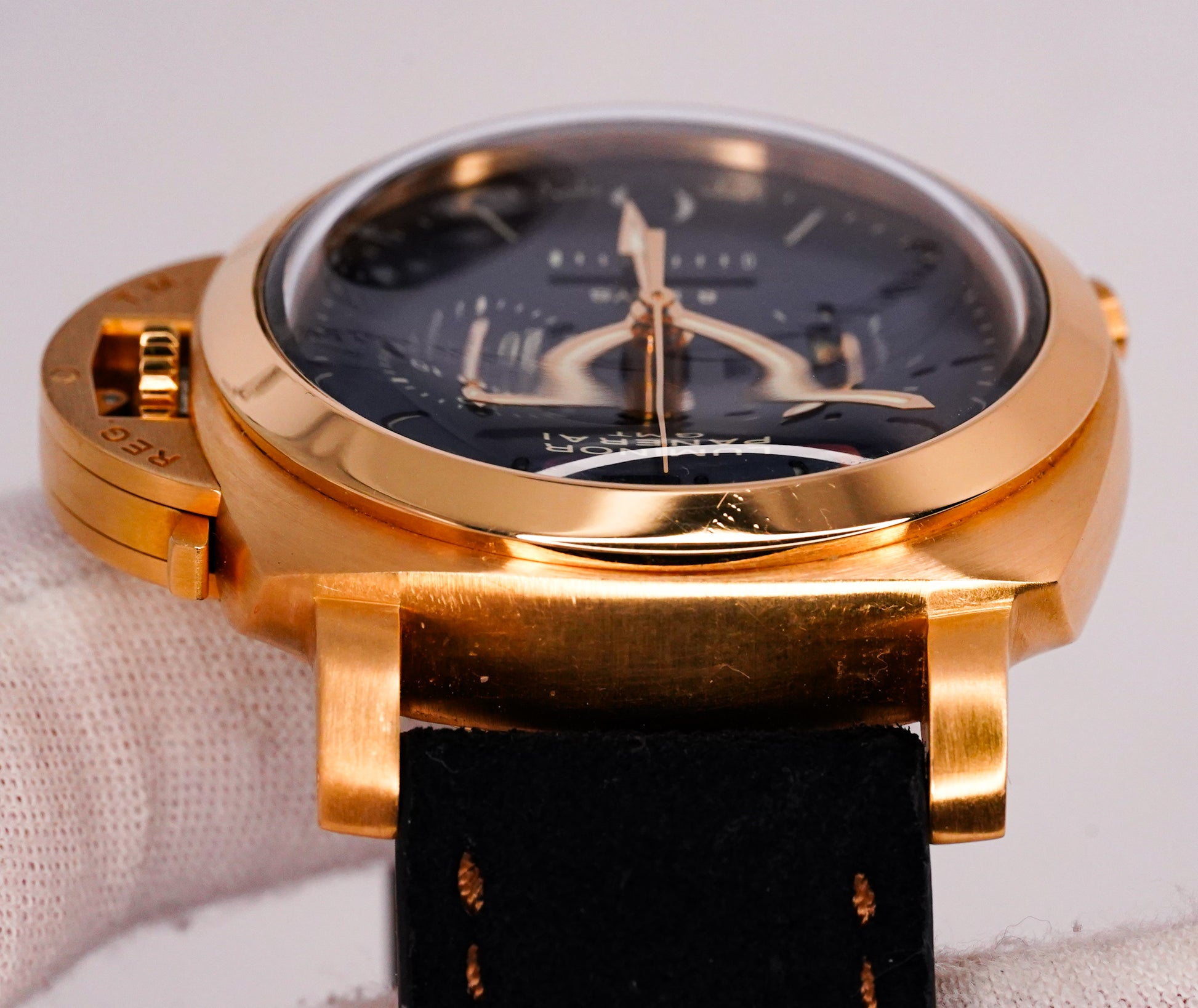 • Classic Luminor crown guard and clean chronograph layout