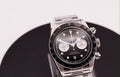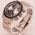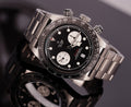 Dial: Deep black matte dial with recessed white chronograph registers, red accents, and classic snowflake hands.