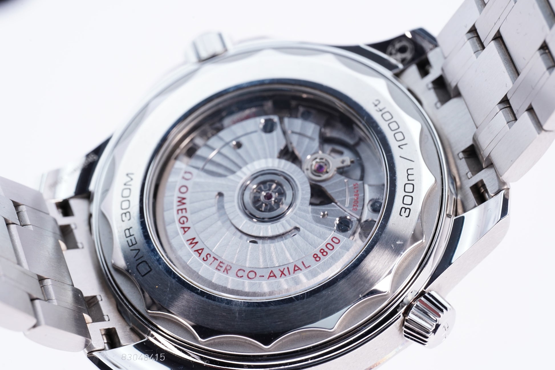 At its core is the Omega Co-Axial Master Chronometer Caliber 8800, offering a 55-hour power reserve and full resistance to magnetic fields of up to 15,000 gauss. The transparent caseback reveals its decorated movement, and the screw-down crown and helium escape valve underscore its professional dive heritage.