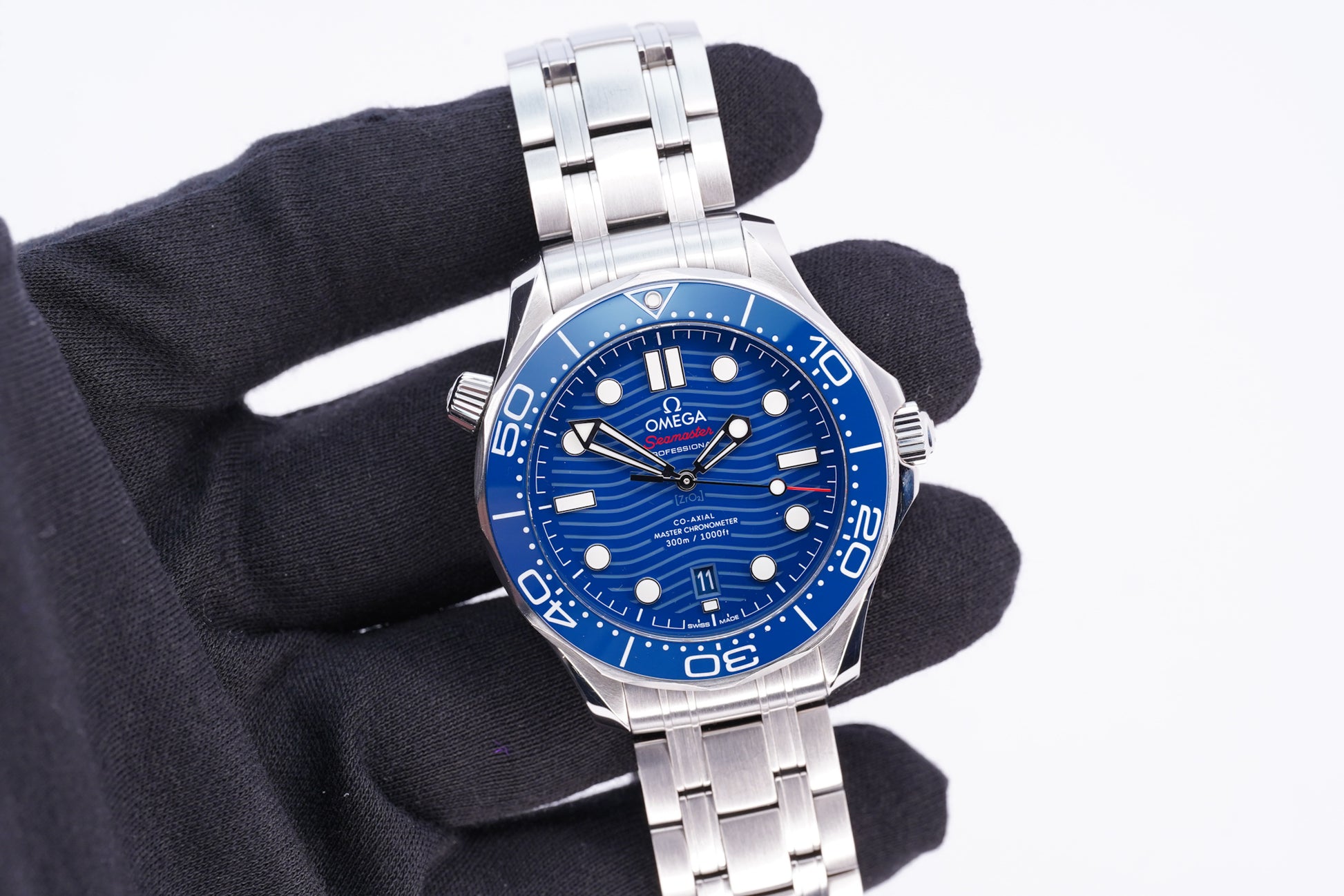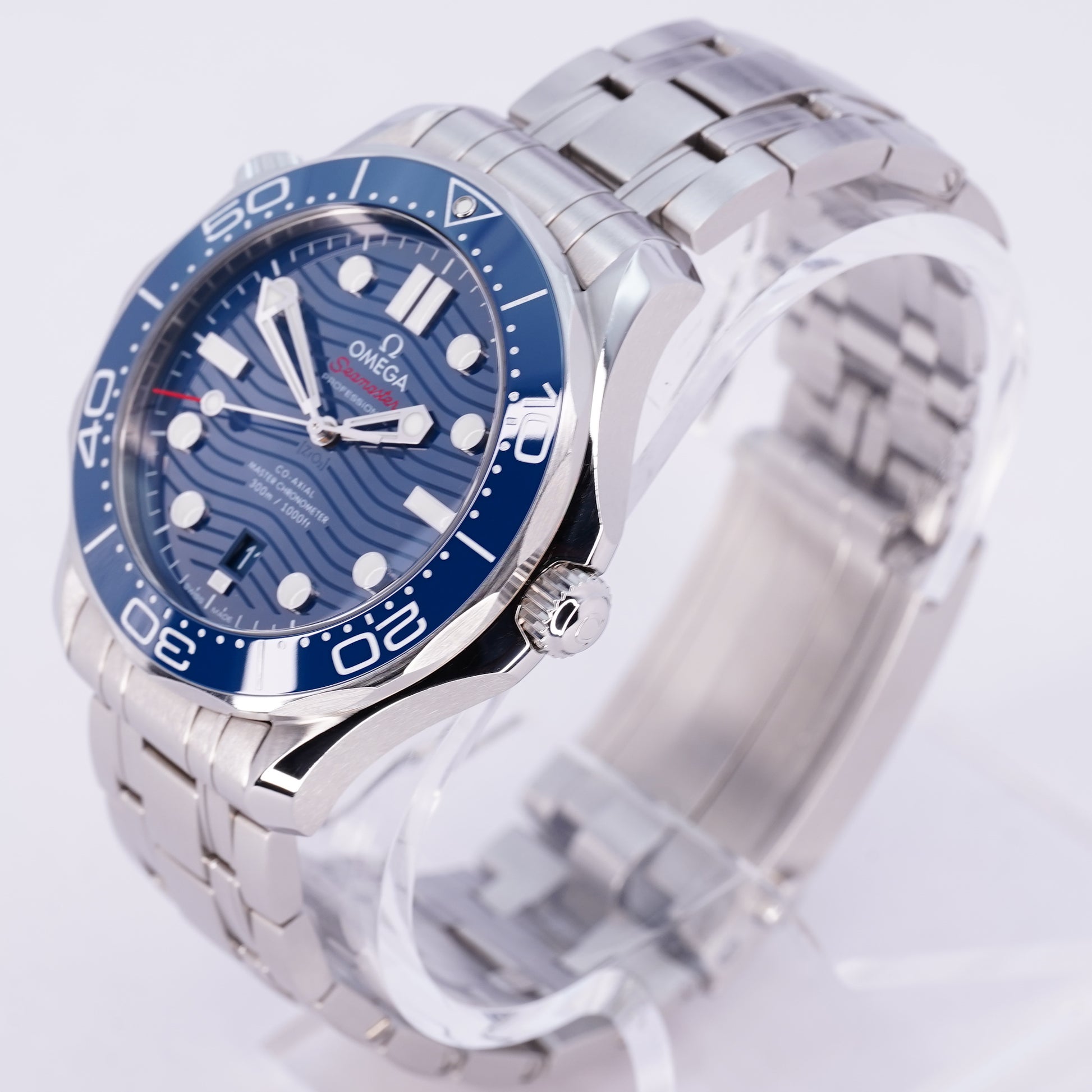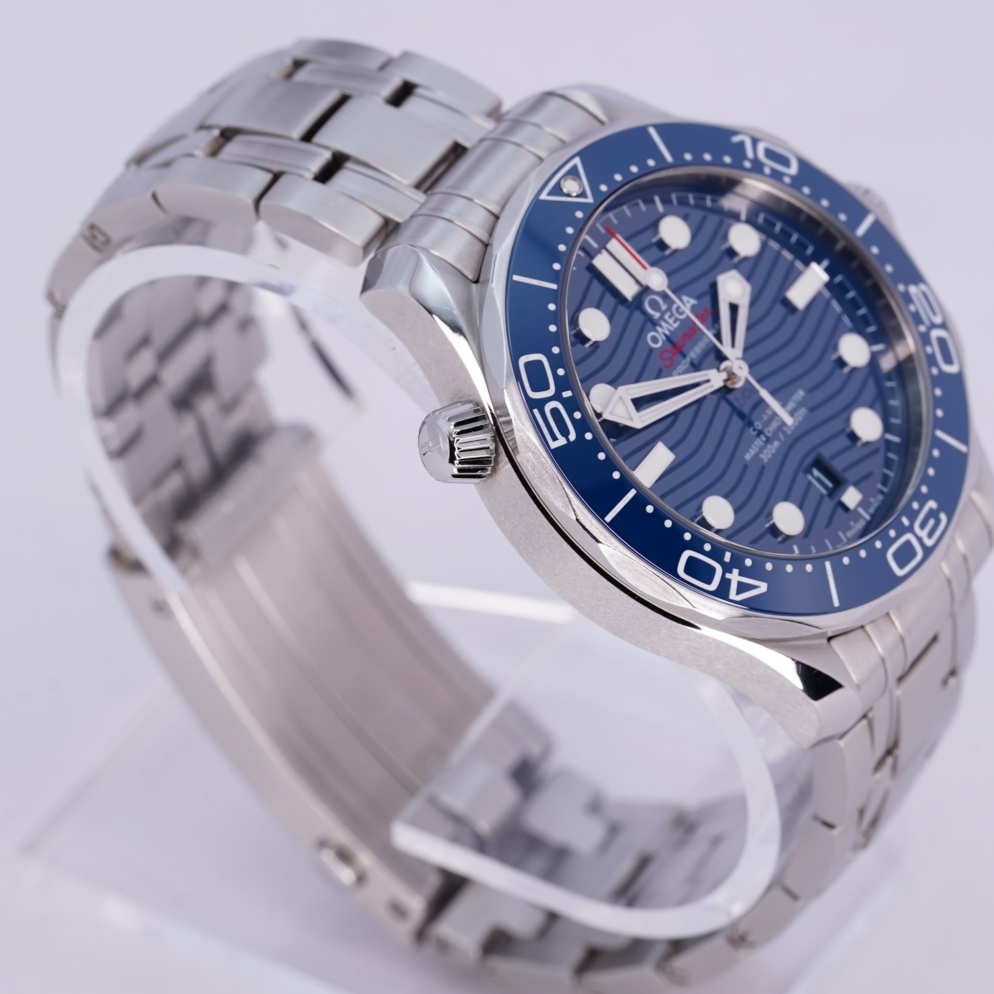 This Omega Seamaster Diver 300M Ref. 210.30.42.20.03.001 blends modern dive-watch performance with refined design. The 42mm stainless steel case is paired with a striking blue ceramic wave-pattern dial, blue ceramic unidirectional bezel, and the factory stainless steel bracelet.