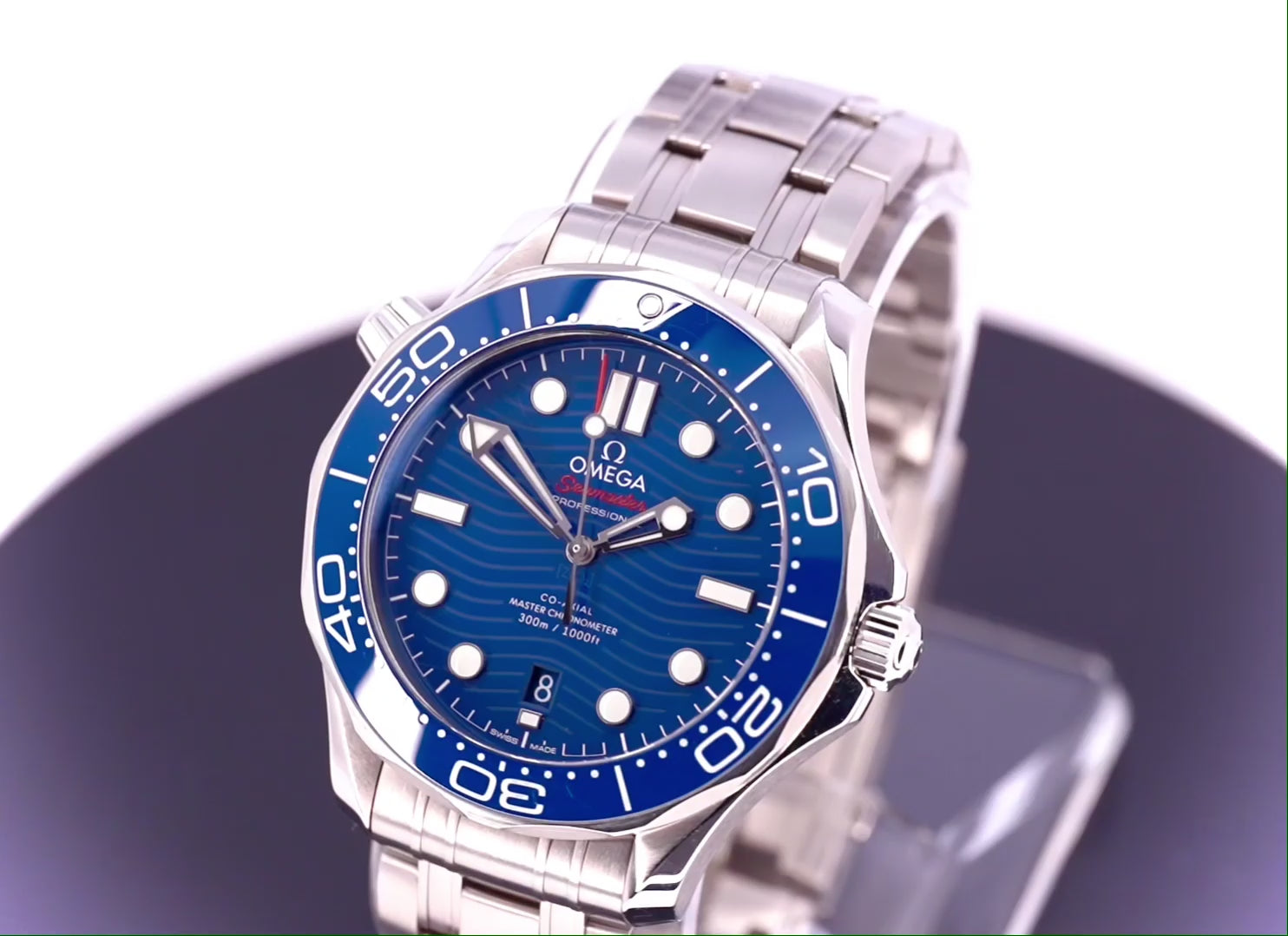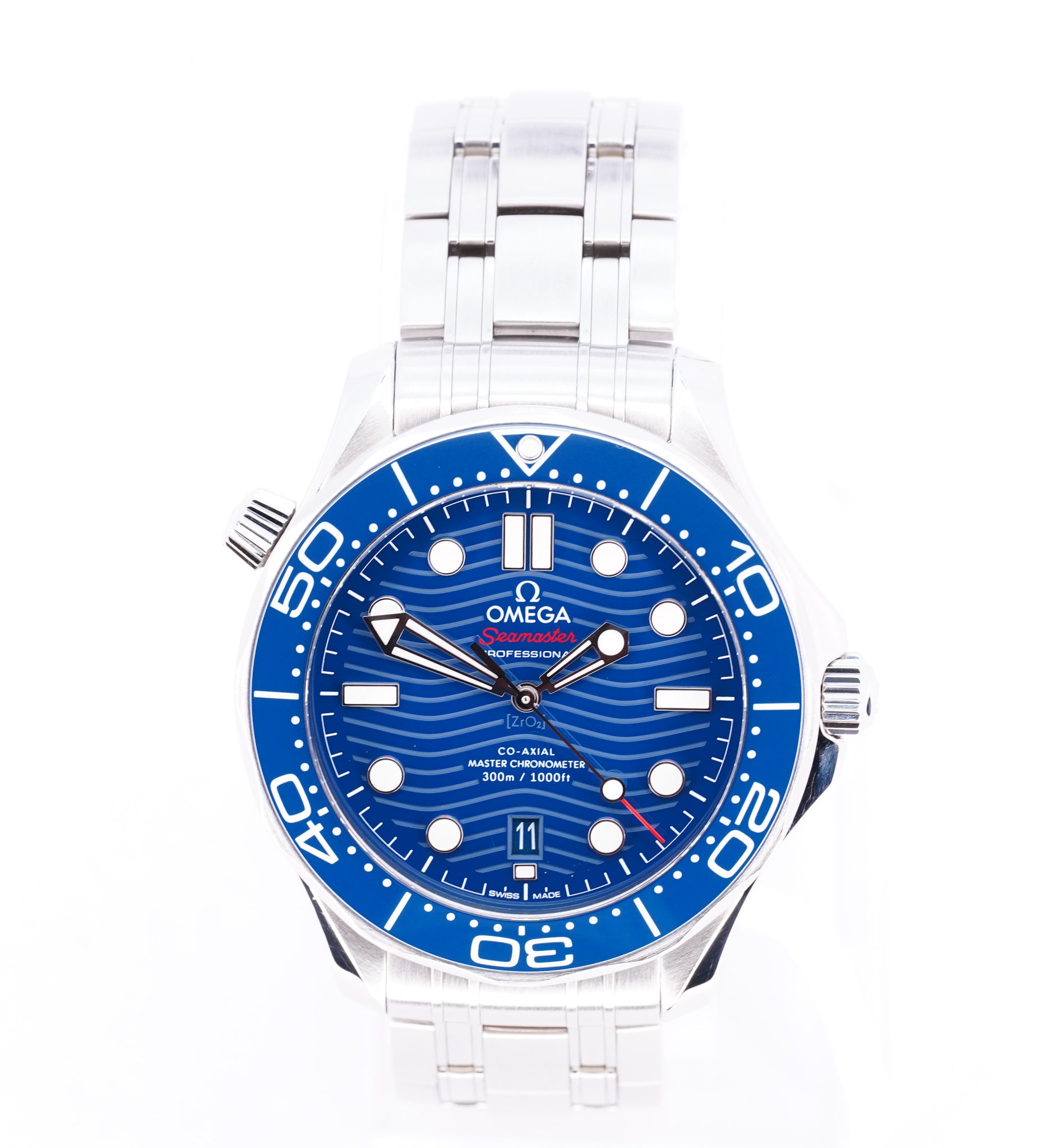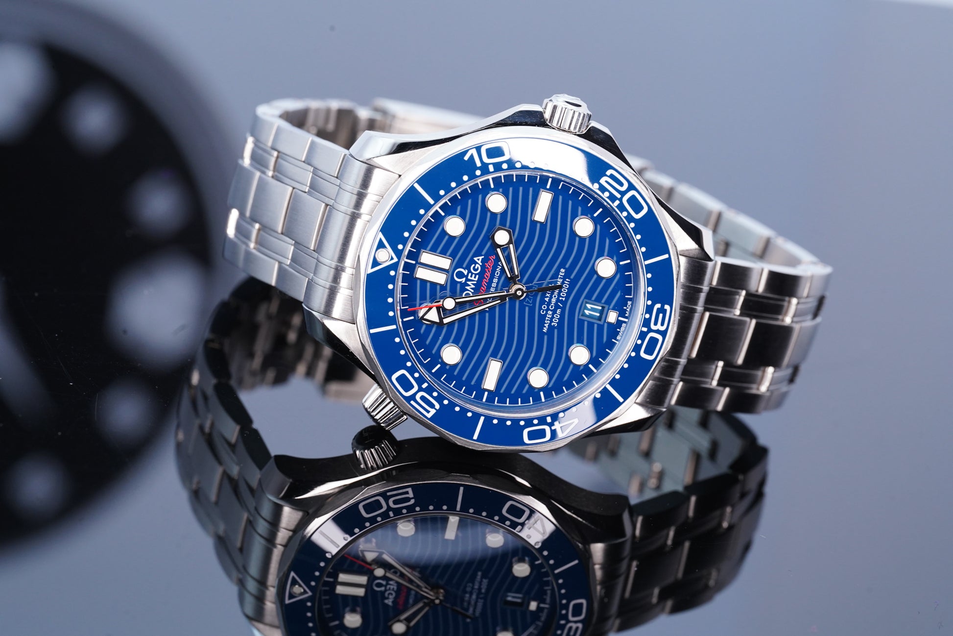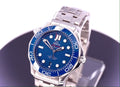 This Omega Seamaster Diver 300M Ref. 210.30.42.20.03.001 blends modern dive-watch performance with refined design. The 42mm stainless steel case is paired with a striking blue ceramic wave-pattern dial, blue ceramic unidirectional bezel, and the factory stainless steel bracelet.