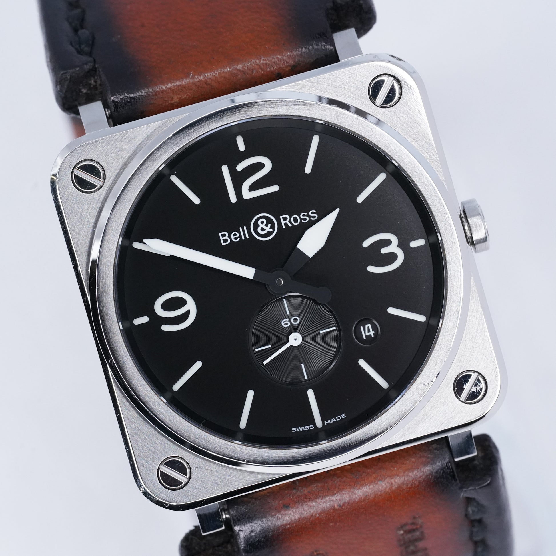 The Bell & Ross BR S-64 is a compact, aviation-inspired timepiece that brings the brand’s iconic square-case design into a versatile 39mm format. Crafted in stainless steel, this reference features a clean black dial with bold Arabic numerals, baton hour markers, and a small seconds sub-dial at 6 o’clock, delivering excellent legibility and classic cockpit-instrument styling.