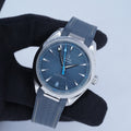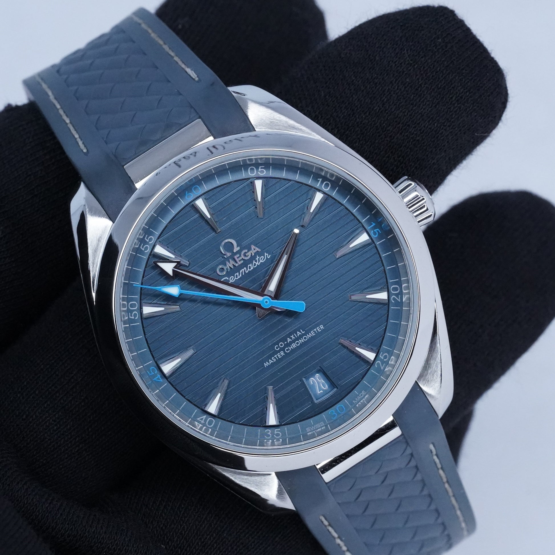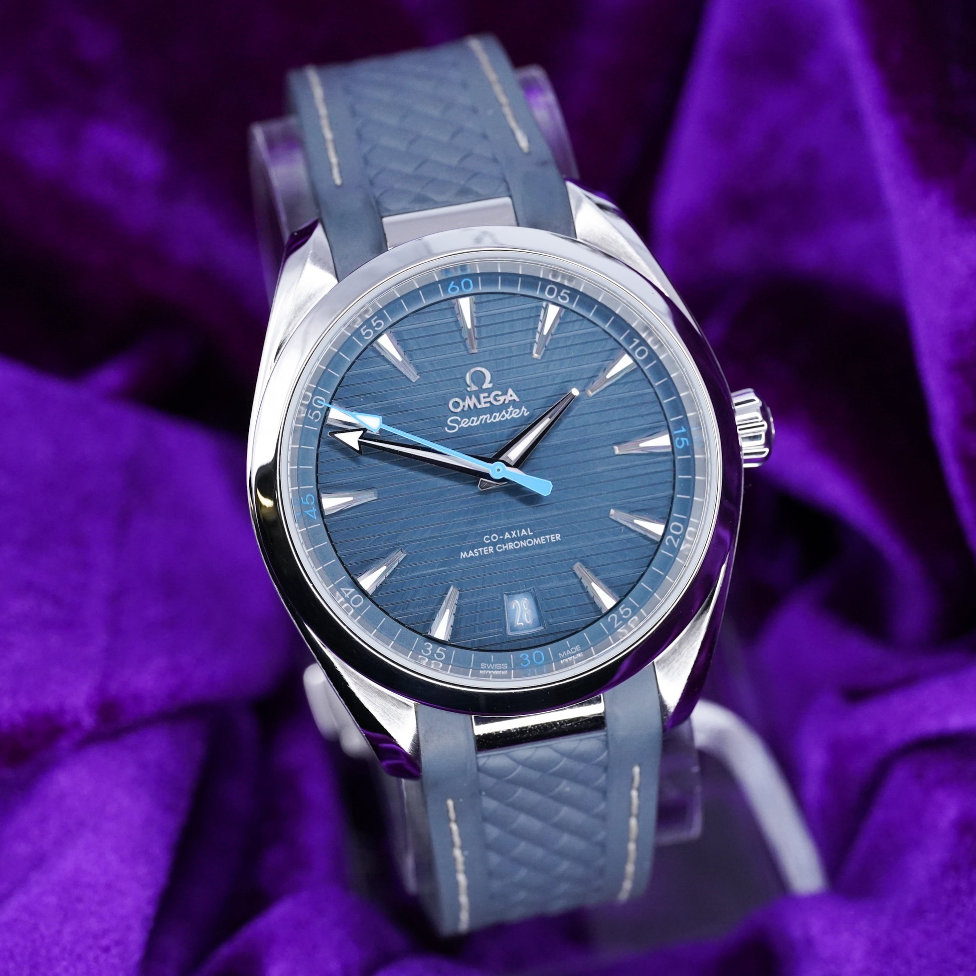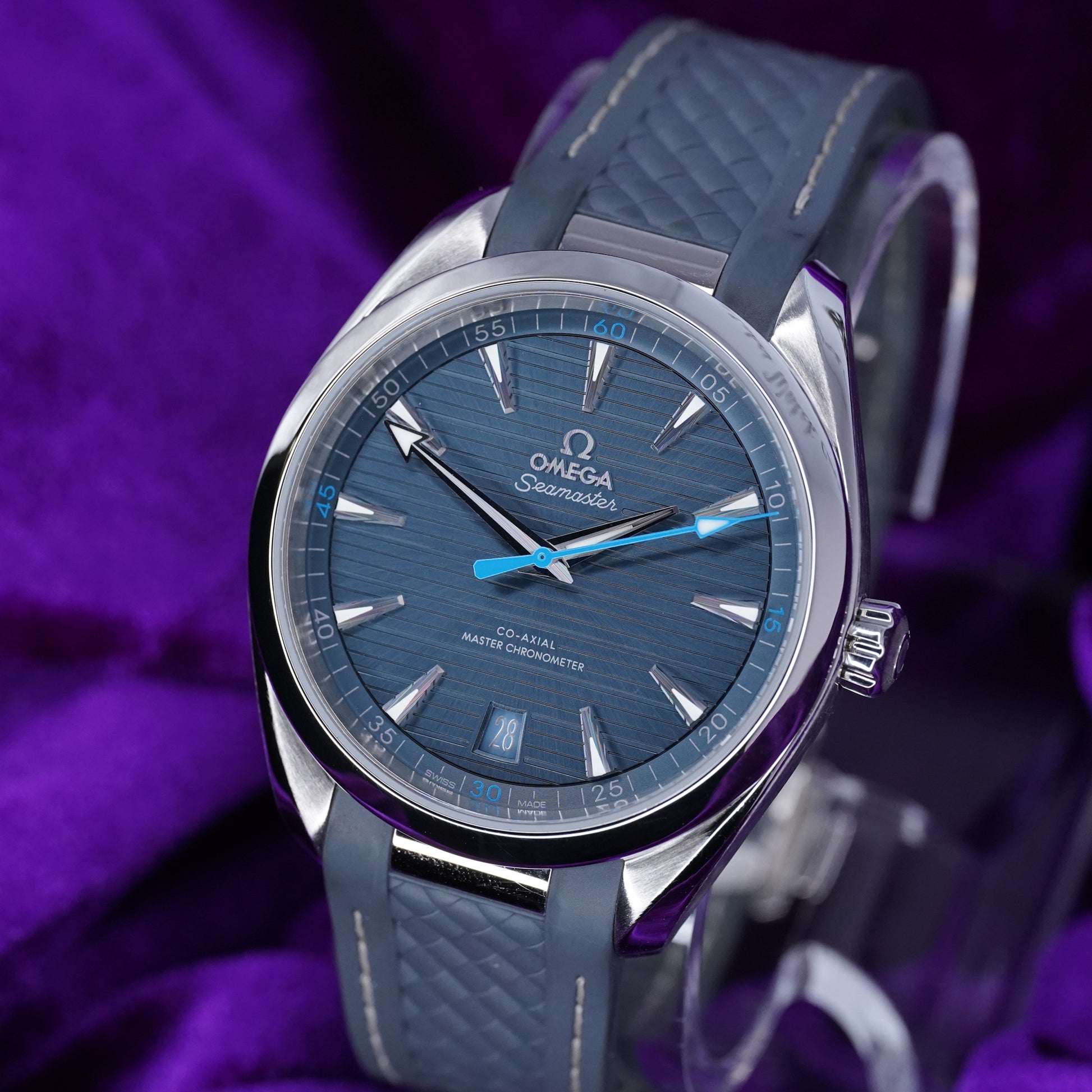 Powered by Omega’s Co-Axial Master Chronometer movement, this automatic timepiece offers exceptional precision, anti-magnetic resistance, and reliable everyday performance. With 150 meters of water resistance and a comfortable gray rubber strap, the Aqua Terra is designed for active lifestyles while maintaining understated luxury. Presented here in very good condition, this example is offered as a full set dated 2024.