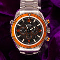 The Omega Seamaster Planet Ocean Chronograph Ref. 2218.50 is a bold professional dive watch that blends Omega’s renowned ocean heritage with high-performance chronograph functionality. This 45.5 stainless steel model stands out with its striking black dial contrasted by orange bezel accents, offering both legibility and a distinctive aesthetic. Equipped with luminous indices, screw-down pushers, and helium escape valve, it is a true professional-grade diver with added sports utility.