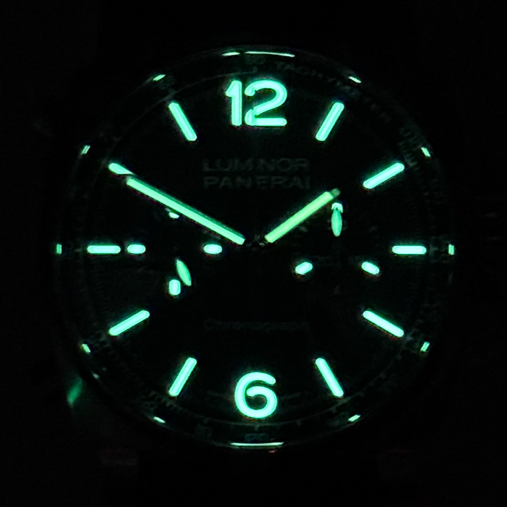 • Classic Luminor crown guard and symmetrical chronograph layout
