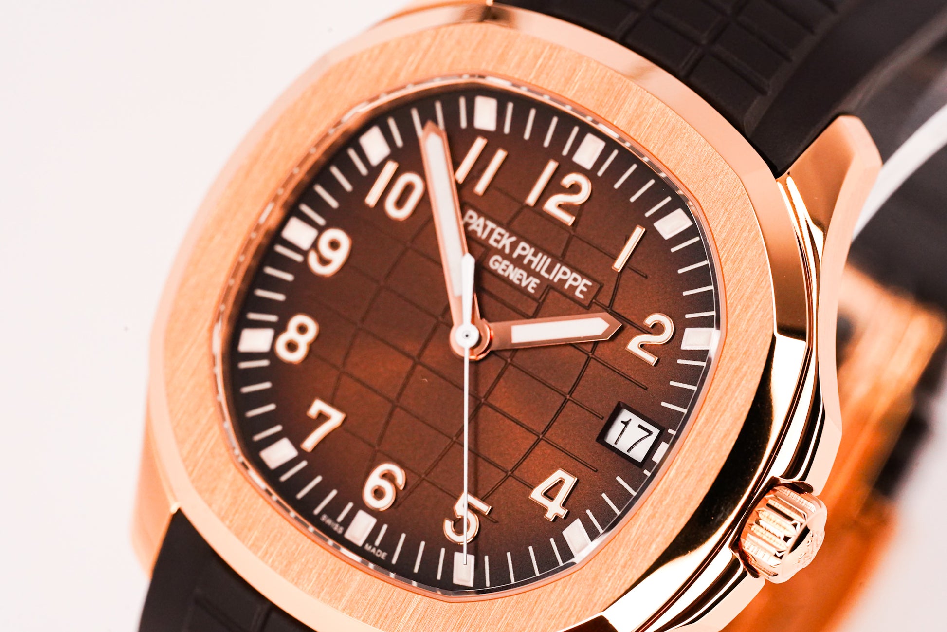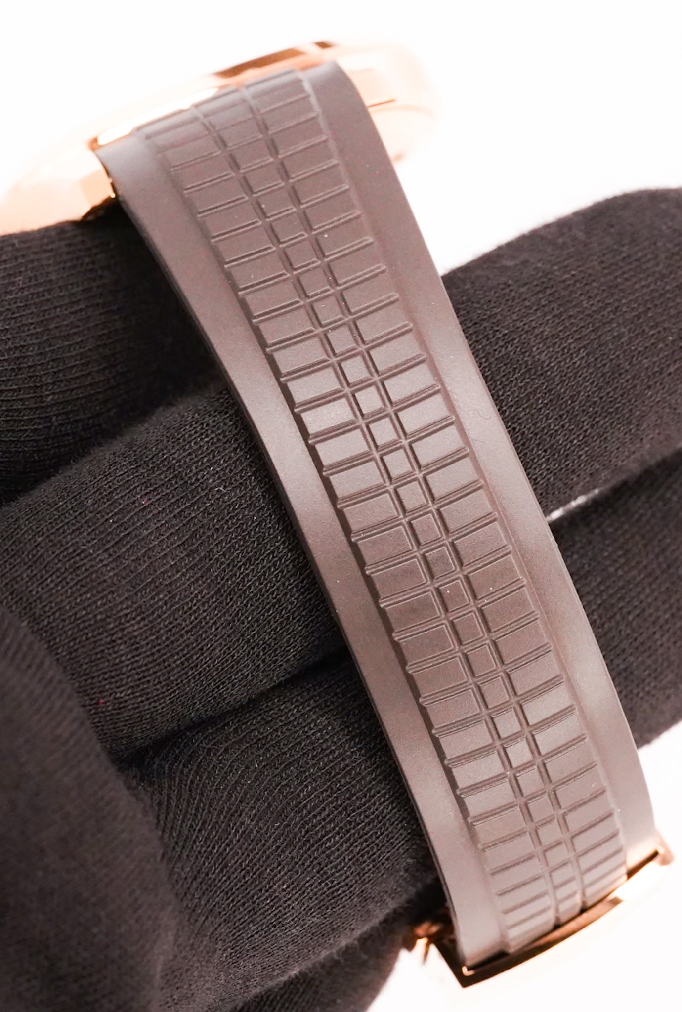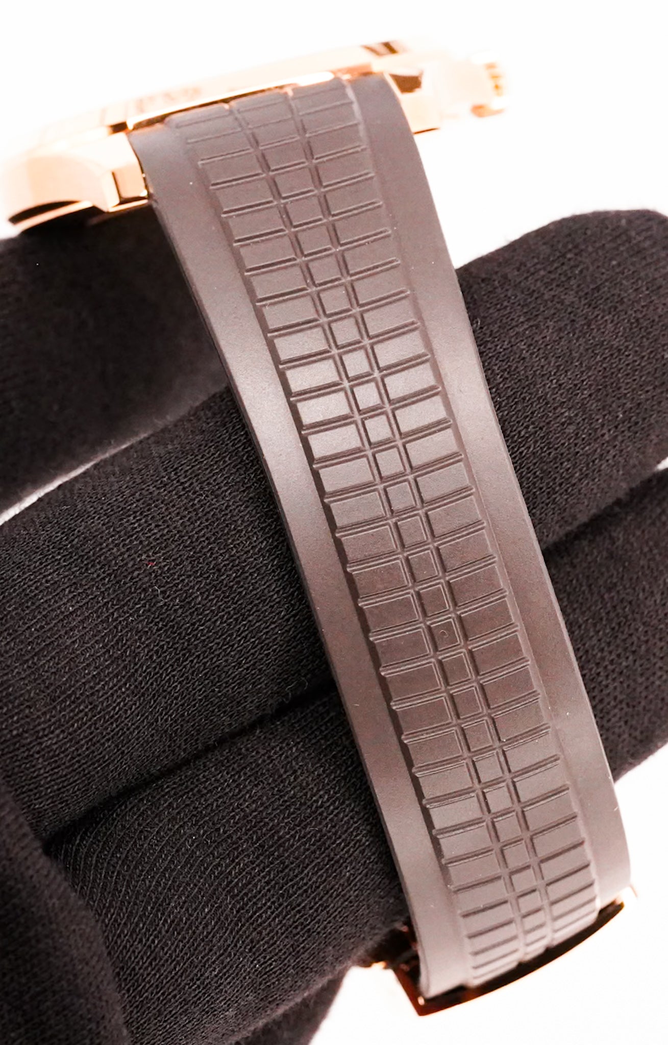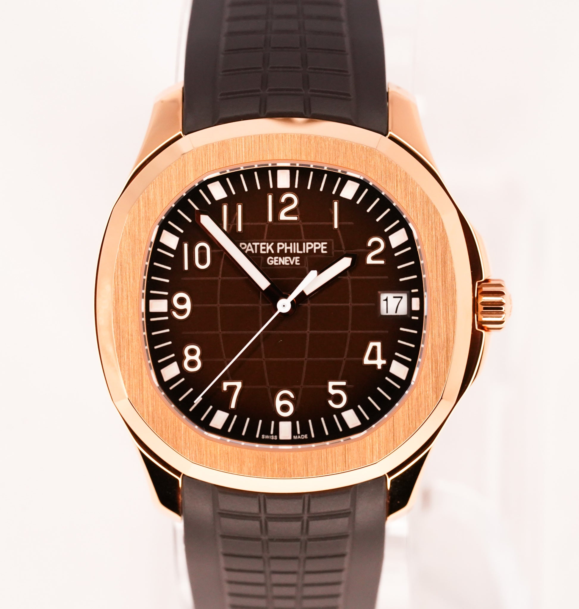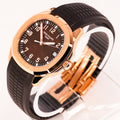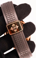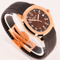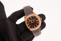 The Patek Philippe Aquanaut Ref. 5167R-001 is one of the brand’s most versatile and contemporary luxury sports watches. Crafted in 18k rose gold, the 40mm case houses a distinctive brown embossed dial with luminous Arabic numerals, combining modern elegance with daily wear practicality. Paired with Patek’s tropical composite strap and rose gold folding clasp, it delivers both comfort and refined style.